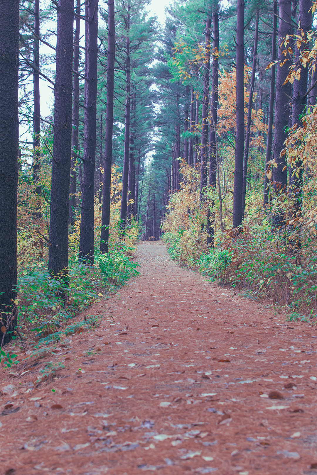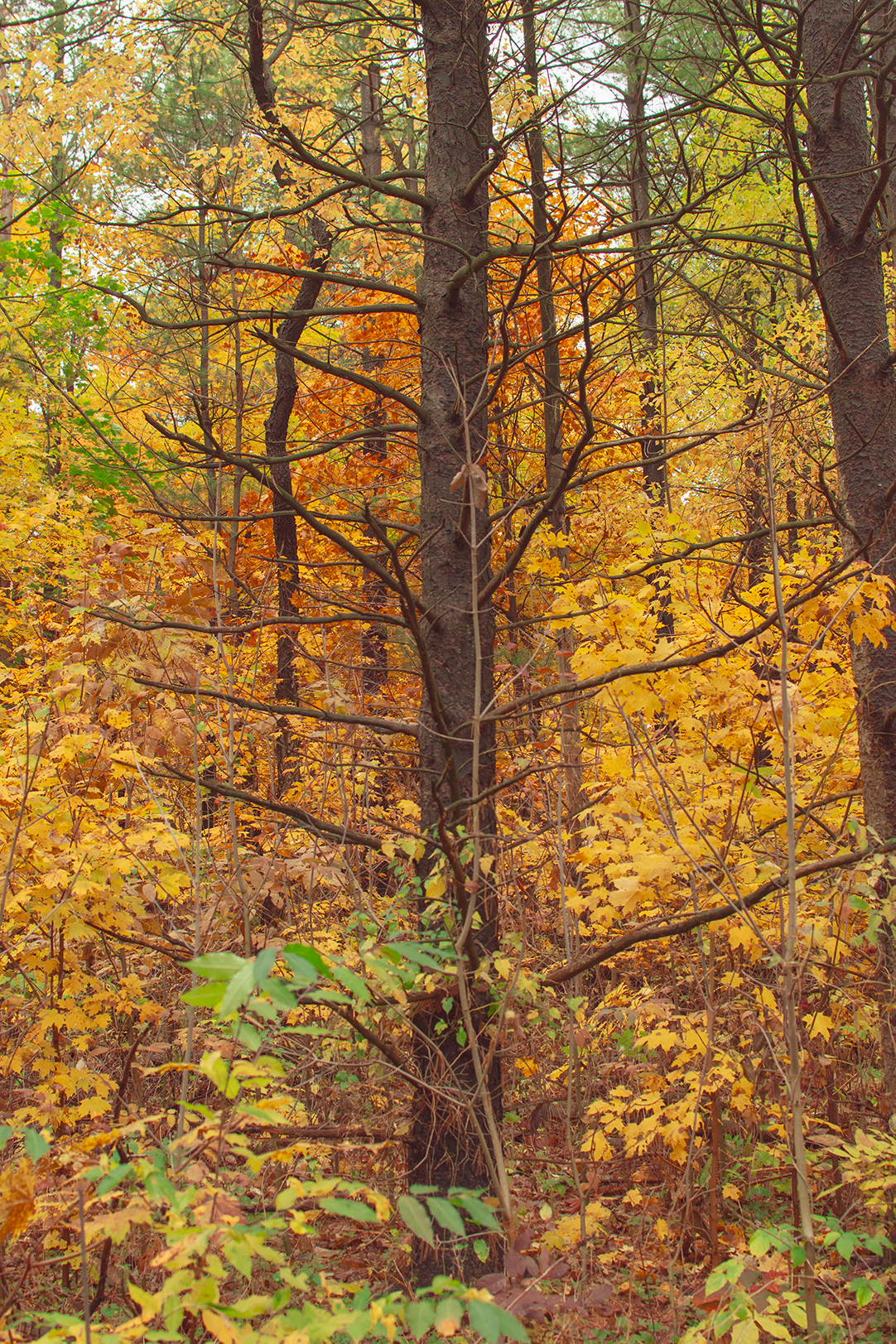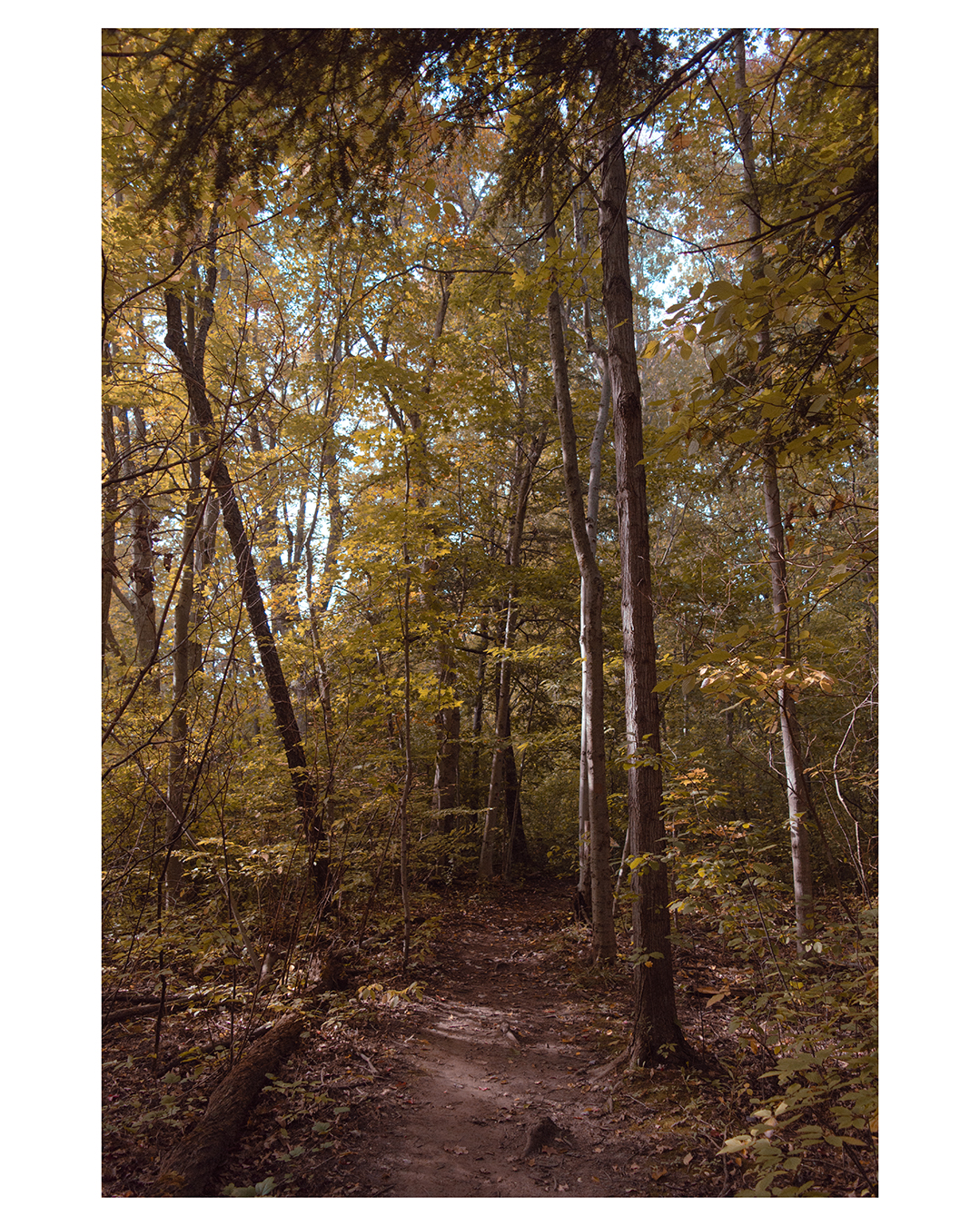 At this moment, I encountered a problem that I hadn’t experienced before. Clearly the most compelling thing to me is the sheer scale of the woodland around me. But it becomes incredibly difficult to make out any details as the midground clutter overshadows the background subject if I try to get the canopy and the ground within the frame. Suddenly my nifty nature shot becomes the next trendy camo pattern sweeping Bass Pro Shops nationwide. This isn’t much of an issue in urban photography, as I have more room to move around and capture my subject without adding distractions. The narrow trails I stood on however, were anything but open and spacious. Dead trees littered the ground, with the next generation rising to replace them. Bushes too, lined the trail, obscuring the trunks of the tall maples and pines.